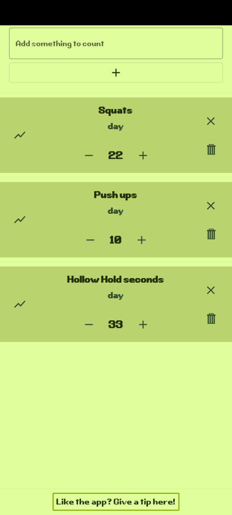 Here’s the main page of the app. As you can see, I am currently becoming mighty by tracking how many reps of each exercise I do in a day. Previously, I used it to track how many M&Ms I ate, but human technology can’t handle numbers that high.